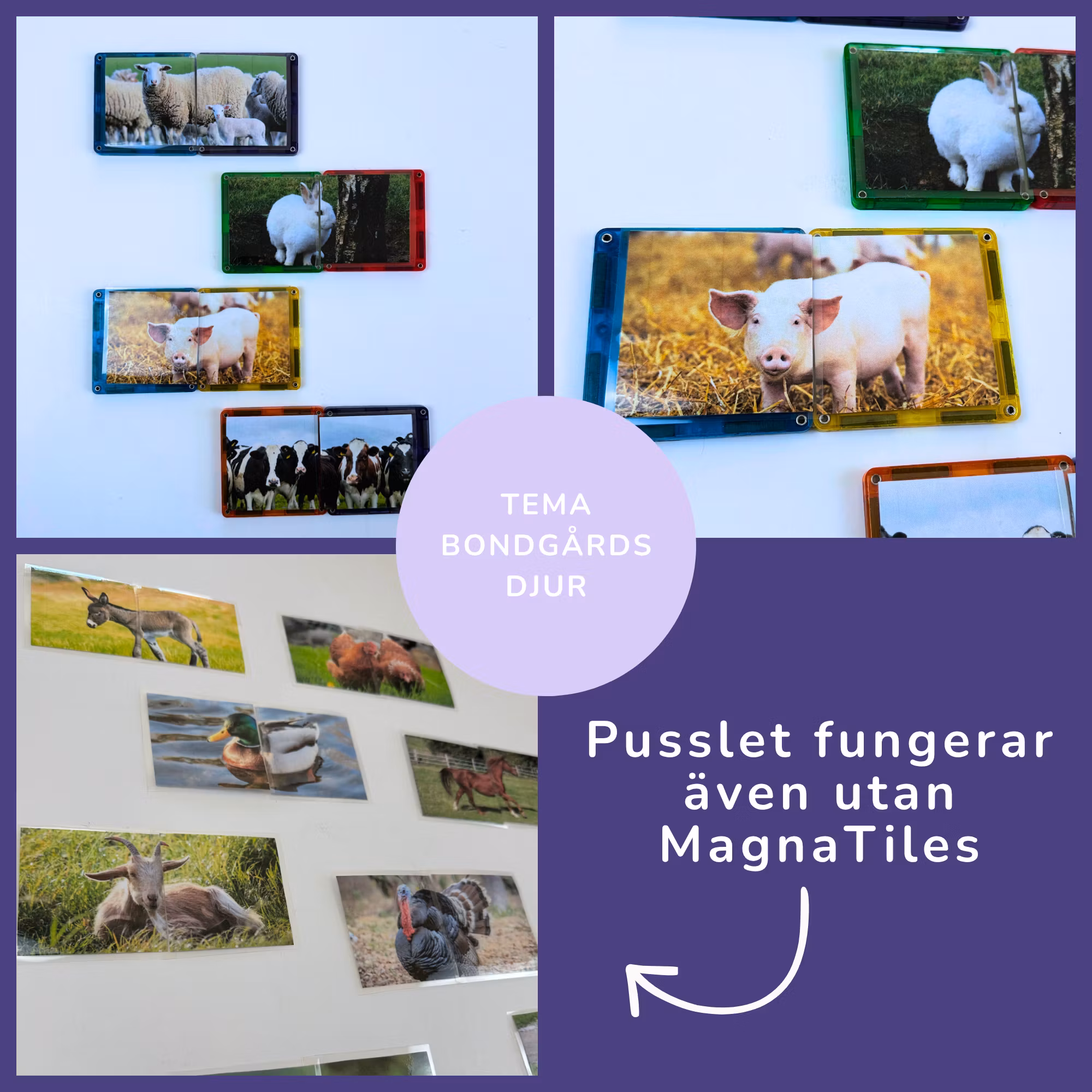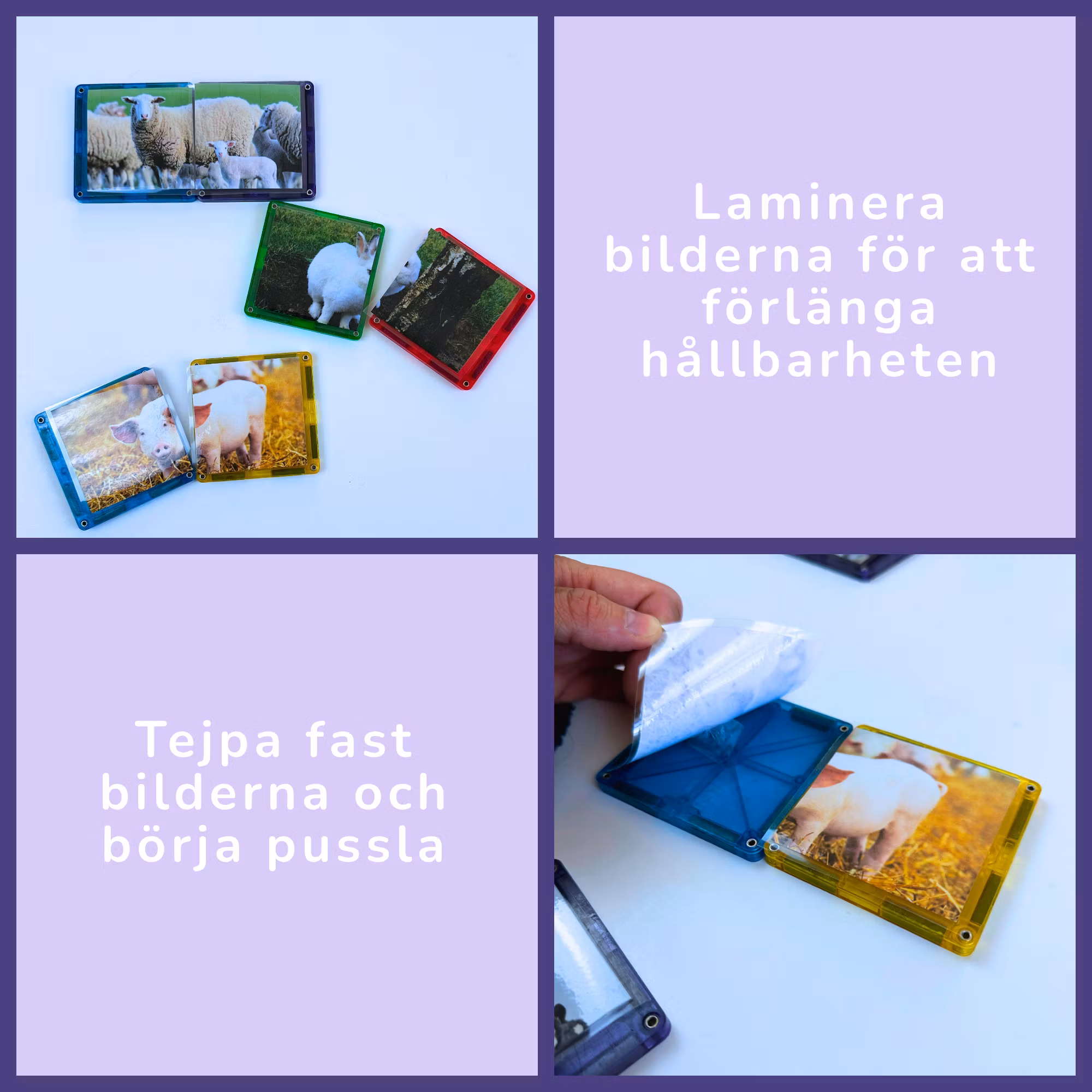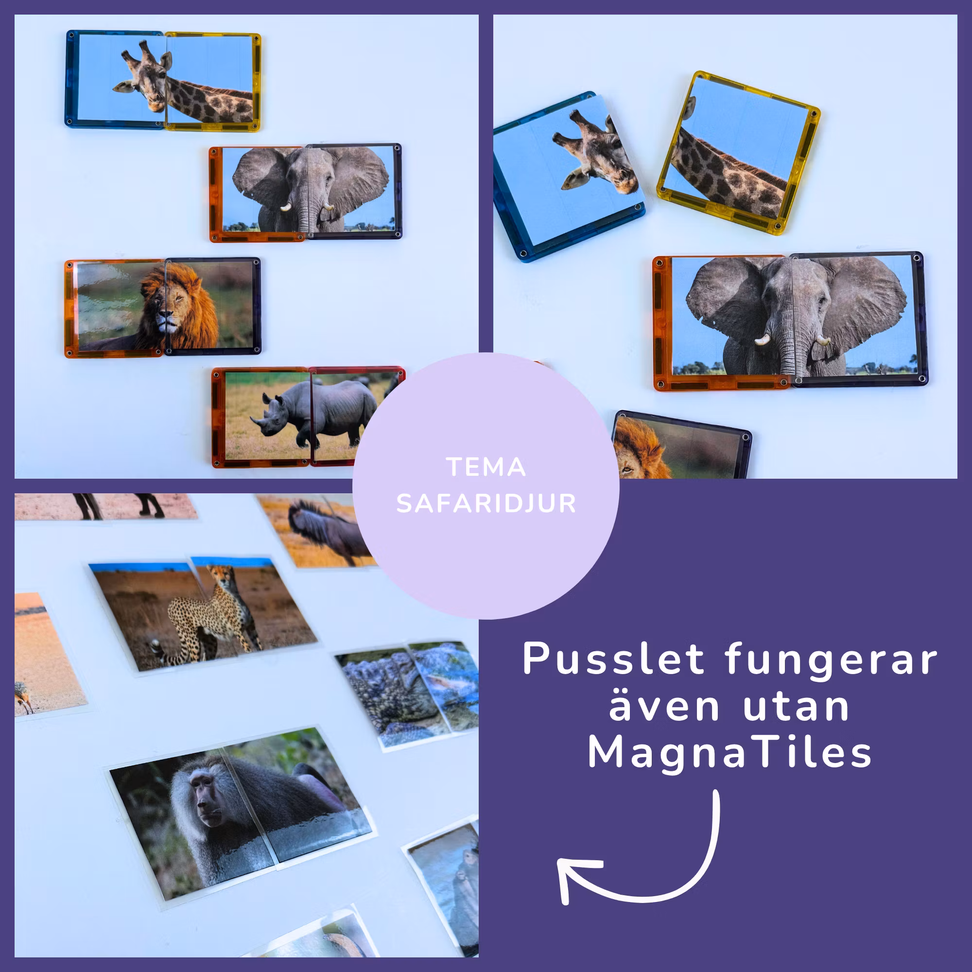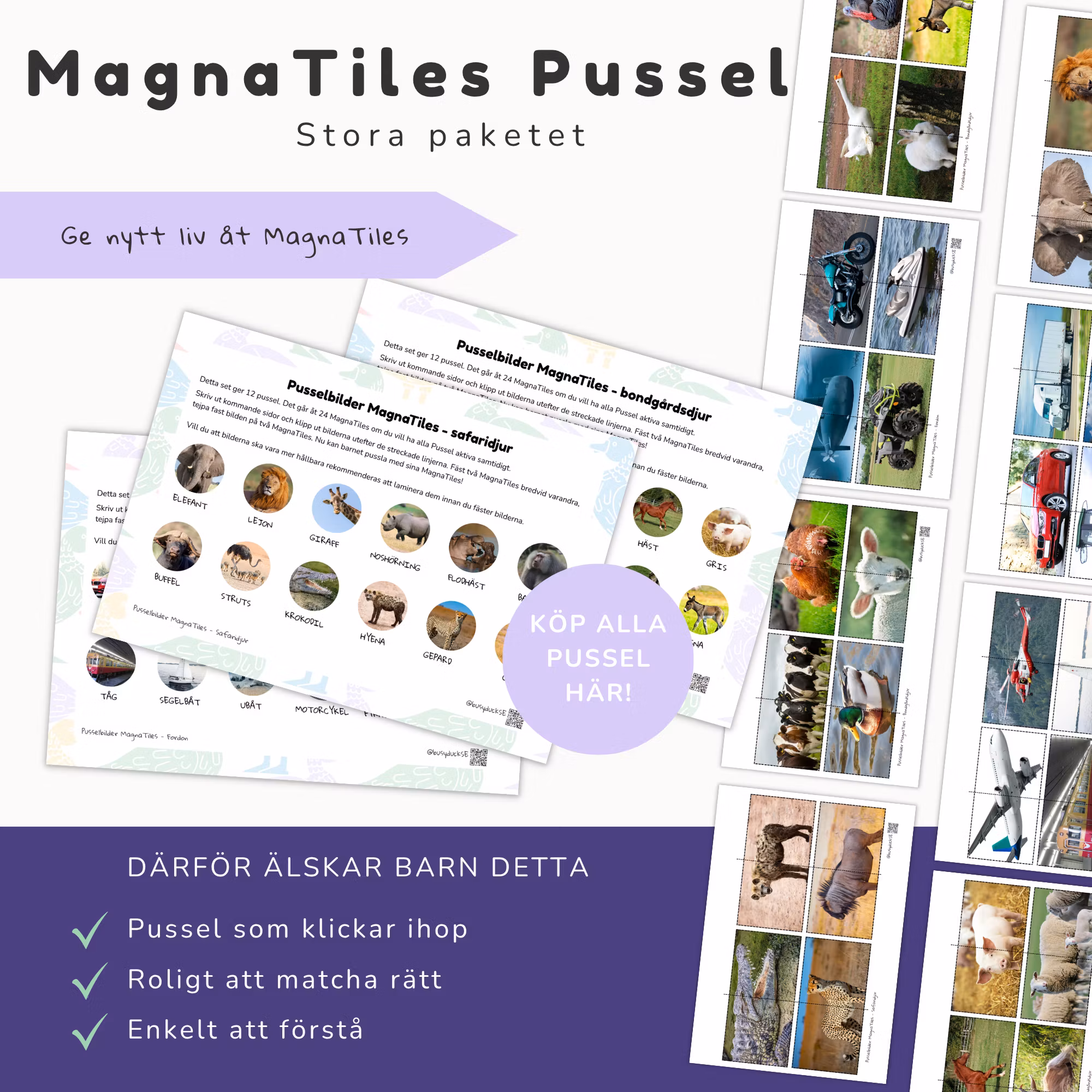 Ge nytt liv åt den älskade leksaken MagnaTiles på bara några minuter till det yngre barnet. Det här är ett enkelt och lekfullt sätt att återanvända leksaken till något helt nytt. Med dessa pussel får du en aktivitet som kombinerar lek, problemlösning och finmotorik utan att du behöver köpa nya leksaker. Du kan variera mellan flera pussel och teman.