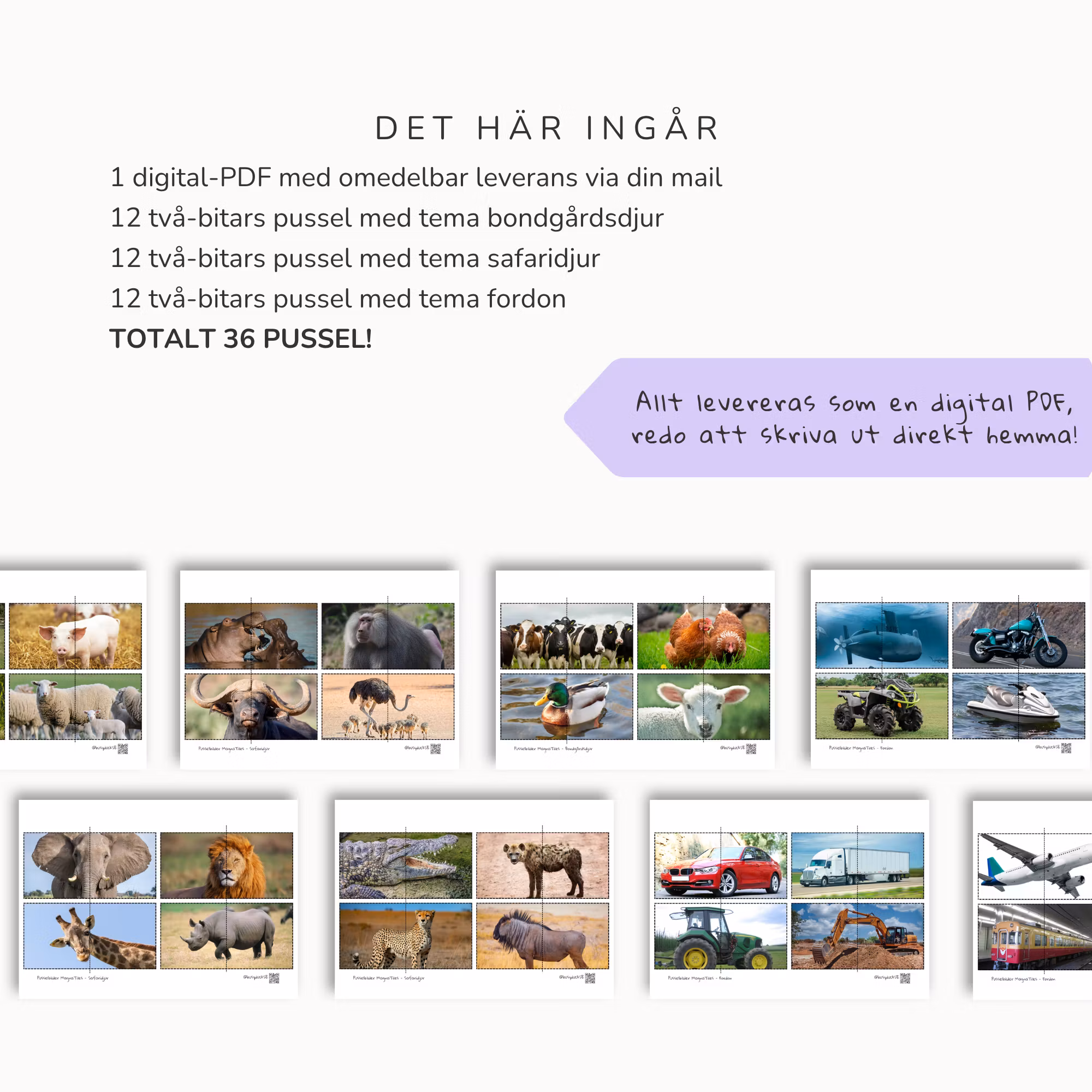 Perfekt för barn som älskar djur på bondgården. Här får barnet pussla ihop djur som lever på bondgård. 12 pussel med olika djur.