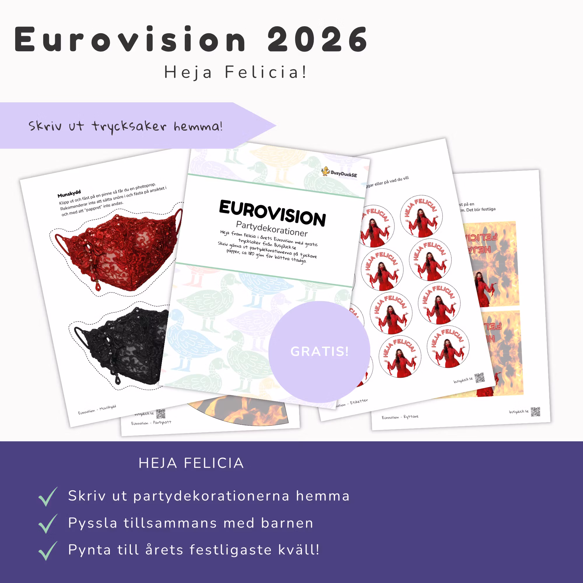 Planerar du en fest, ett firande eller vill du bara visa ditt stöd lite extra till Eurovision 2026? Här har jag tagit fram ett set med trycksaker för att heja fram Felicia i årets Eurovision. Det är helt gratis att ladda ner och skriva ut!
