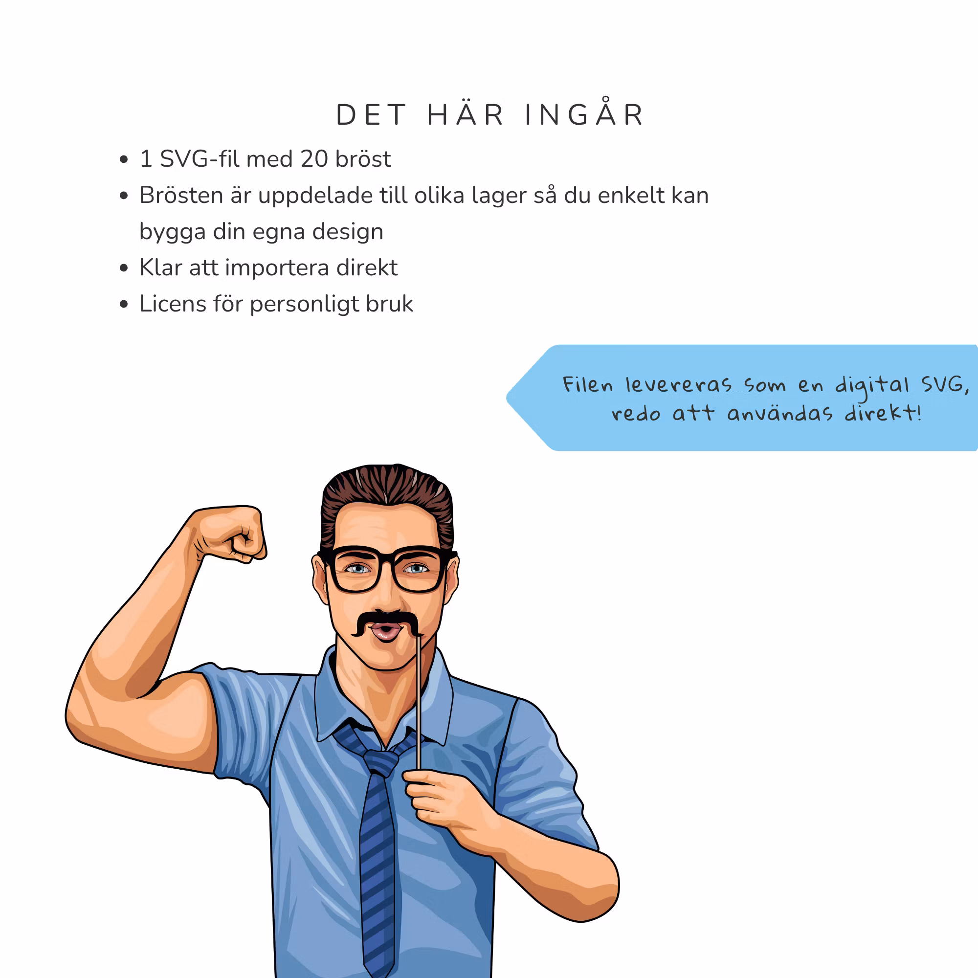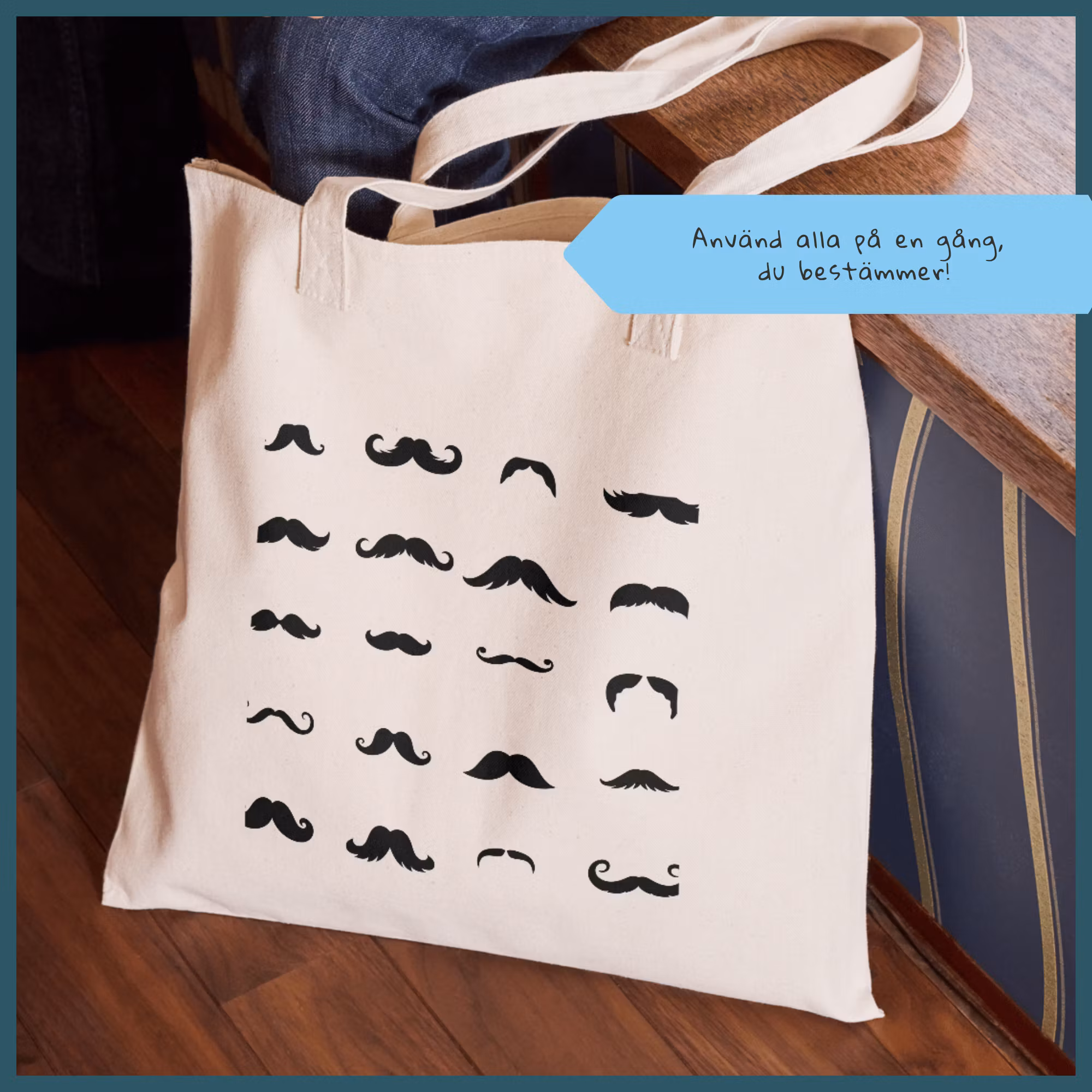 En samling lekfulla mustascher i SVG-format. Perfekt för tryck, klistermärken, muggar, etiketter, temafester, farsdag, maskerad, foto-props och DIY-presenter. Ett snabbt sätt att skapa humoristiska projekt och personliga gåvor.
