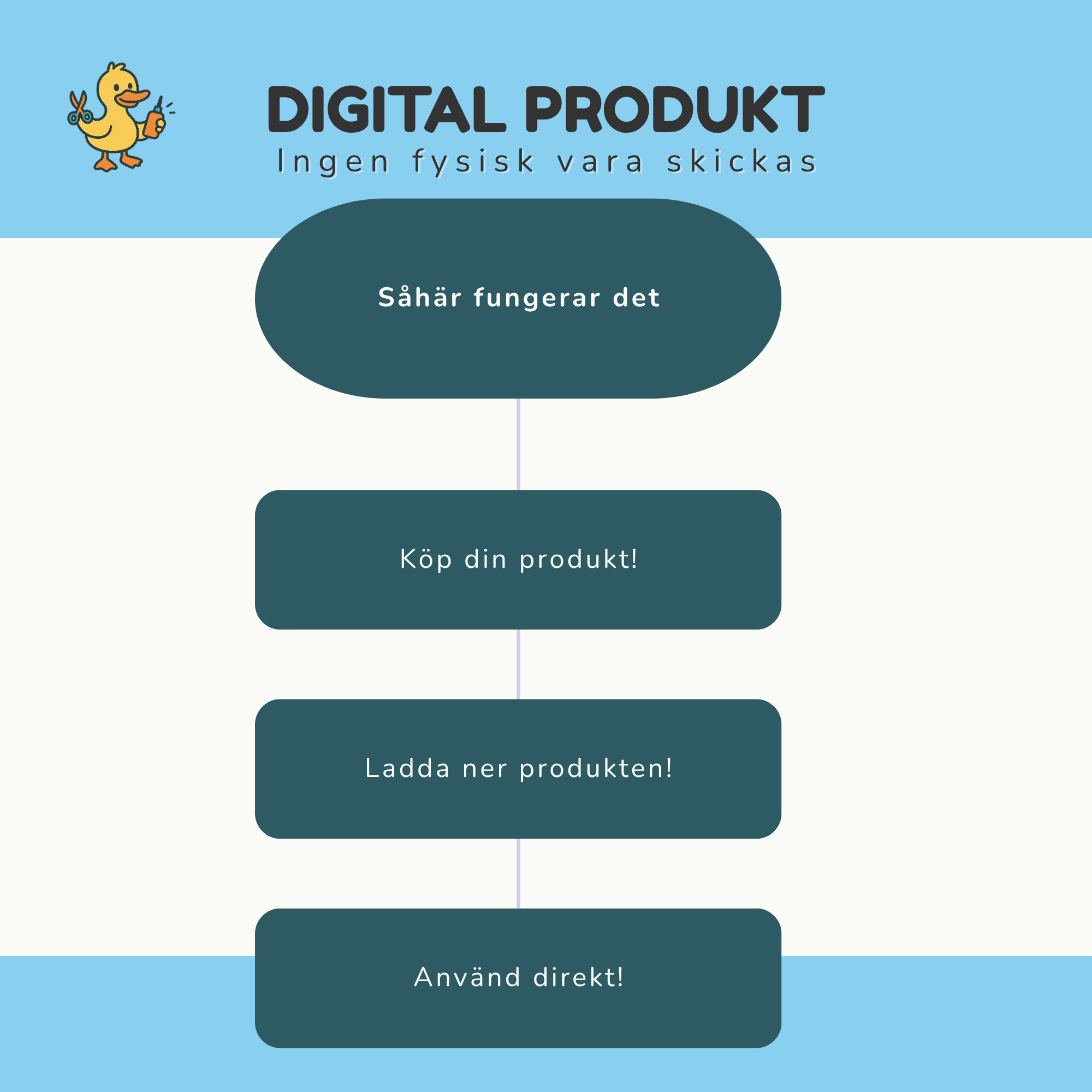 Detta är en digital produkt (SVG) som levereras direkt till den e-postadress du anger vid köp. Ingen fysisk vara skickas. Du har tillgång till filen i 30 dagar efter köpet, så ladda gärna ner den direkt.
