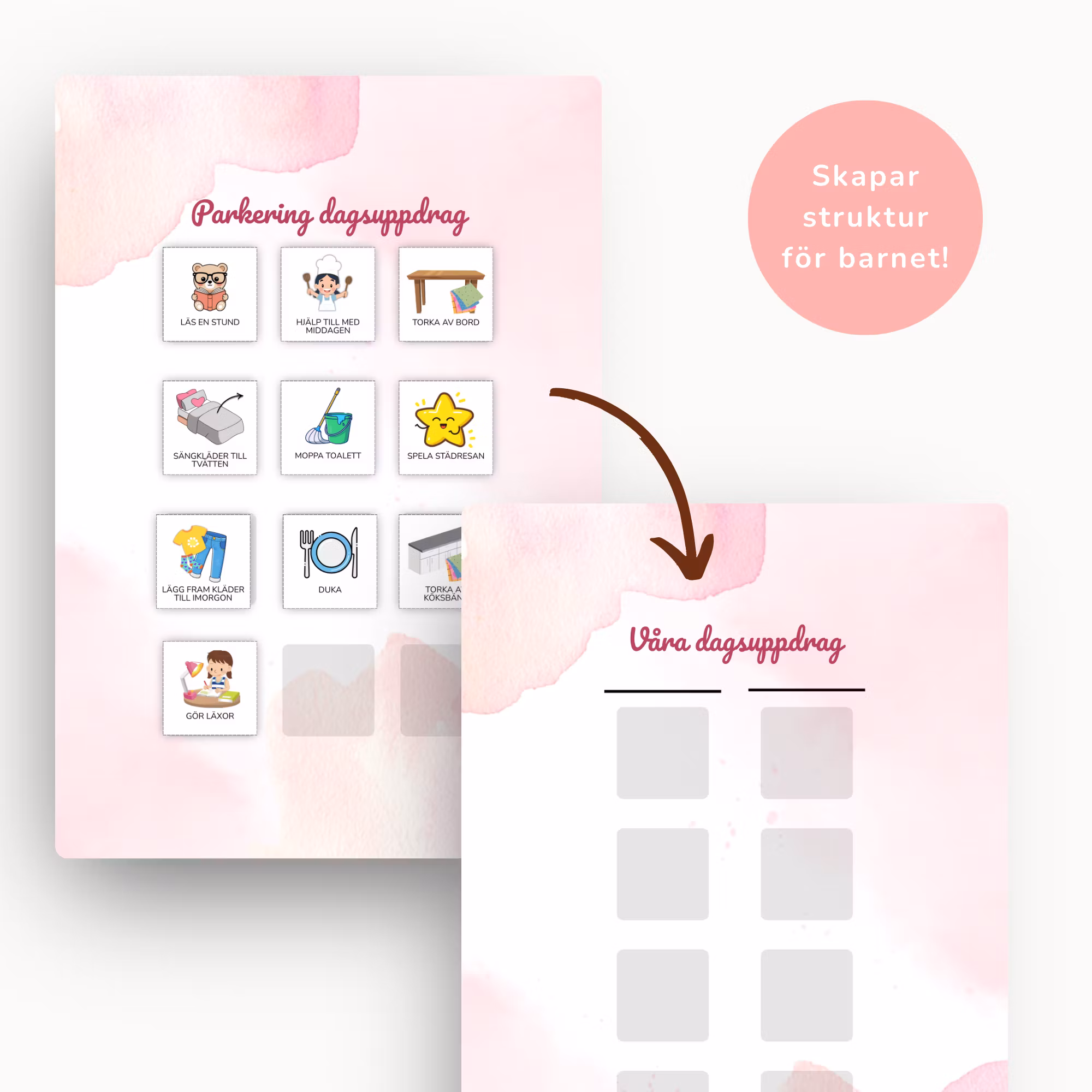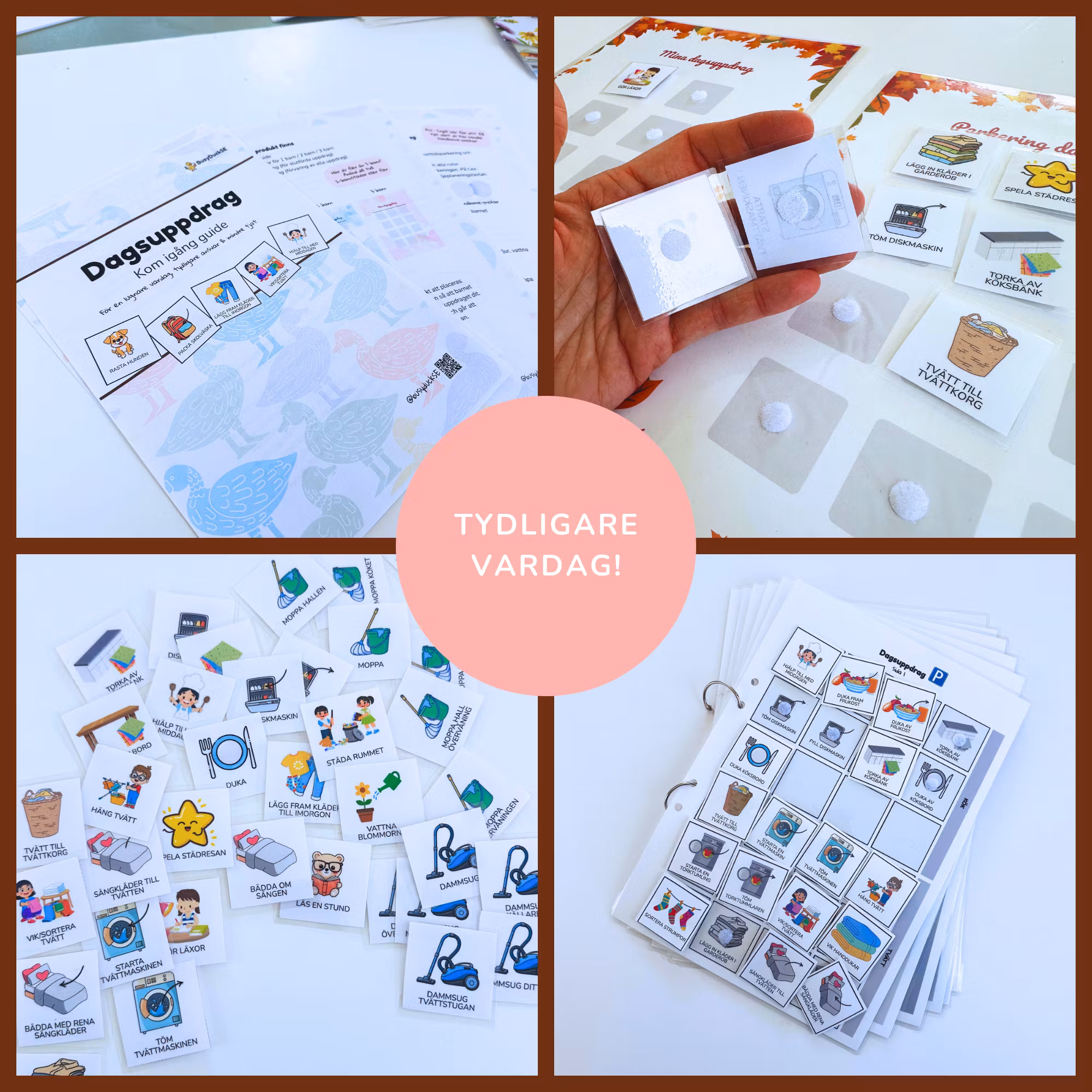 Skapa struktur i vardagen med Dagsuppdrag Baskit. 70 visuella uppdrag som hjälper barn ta ansvar hemma utan tjat, mutor eller poängsystem. Digital PDF.