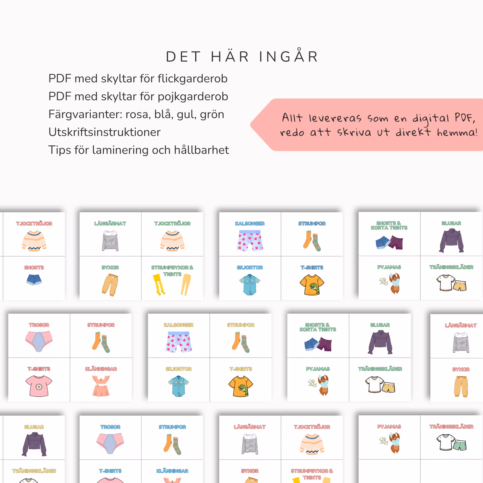 Skyltarna är indelade i två kategorier, flickor och pojkar. Exempelvis kalsonger osv i pojkarnas garderob. Trosor, klänning och strumpbyxor osv till flickornas garderob. Självklart är det inte på något sätt BusyDuck's syn på hur du ska klä dina/ditt barn. Alla skyltar finns i färgerna rosa, gult, blått och grönt. Skriv ut och blanda precis som ditt/dina barns behov ser ut.