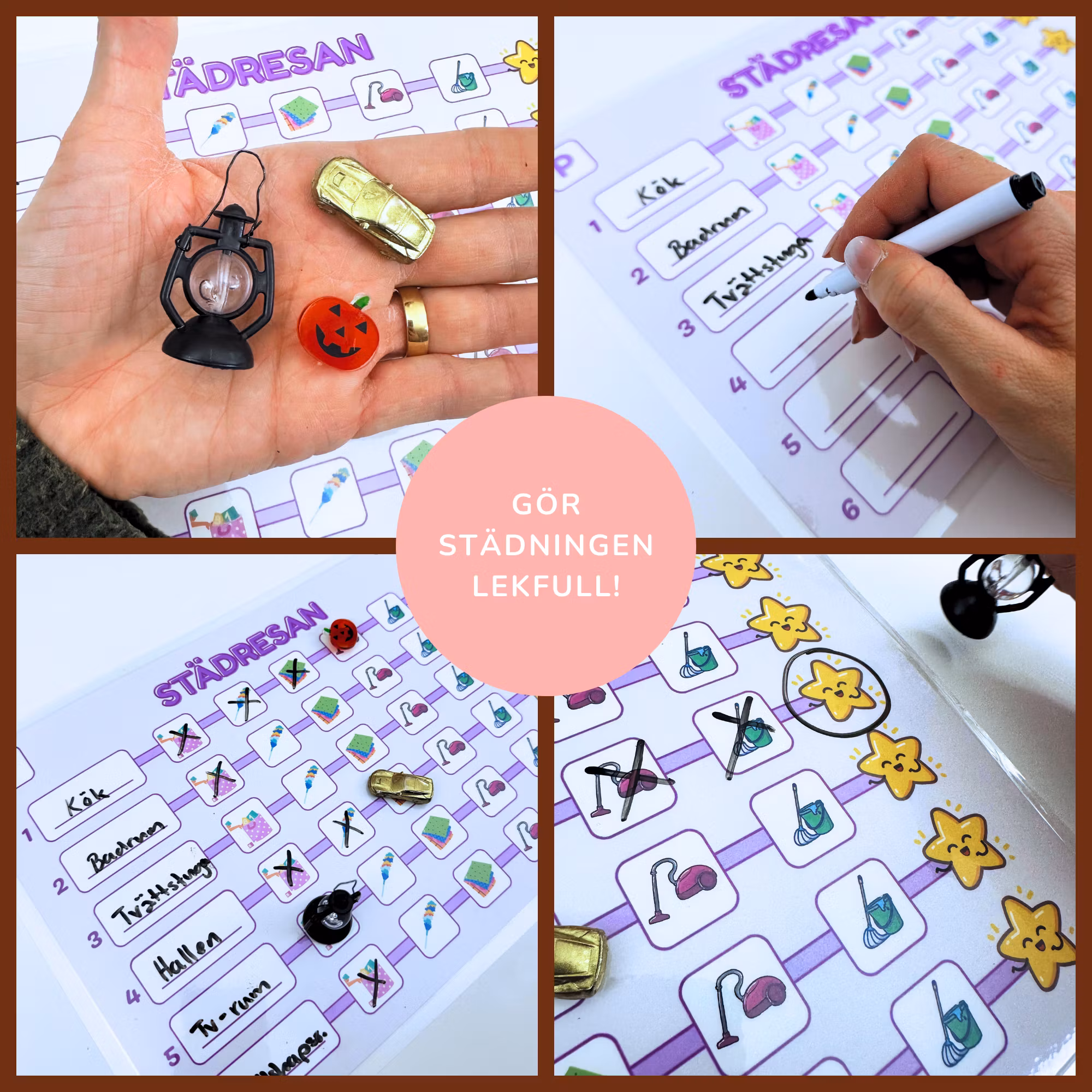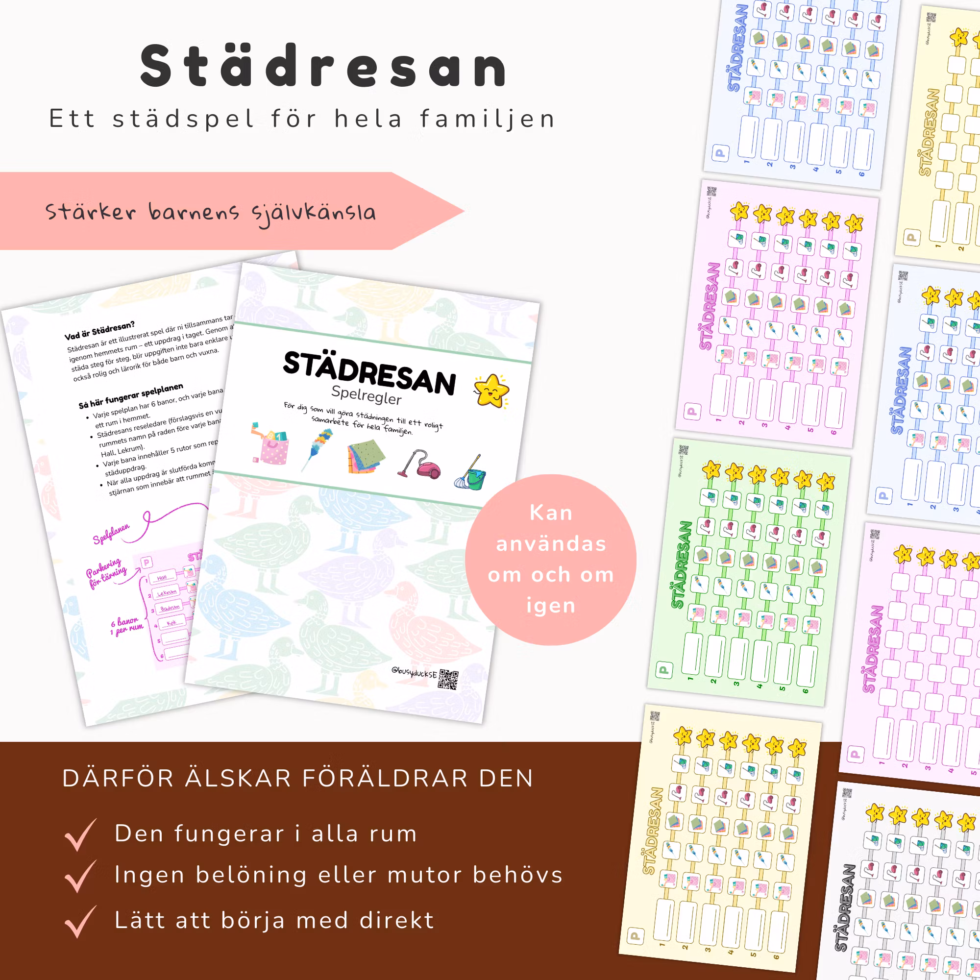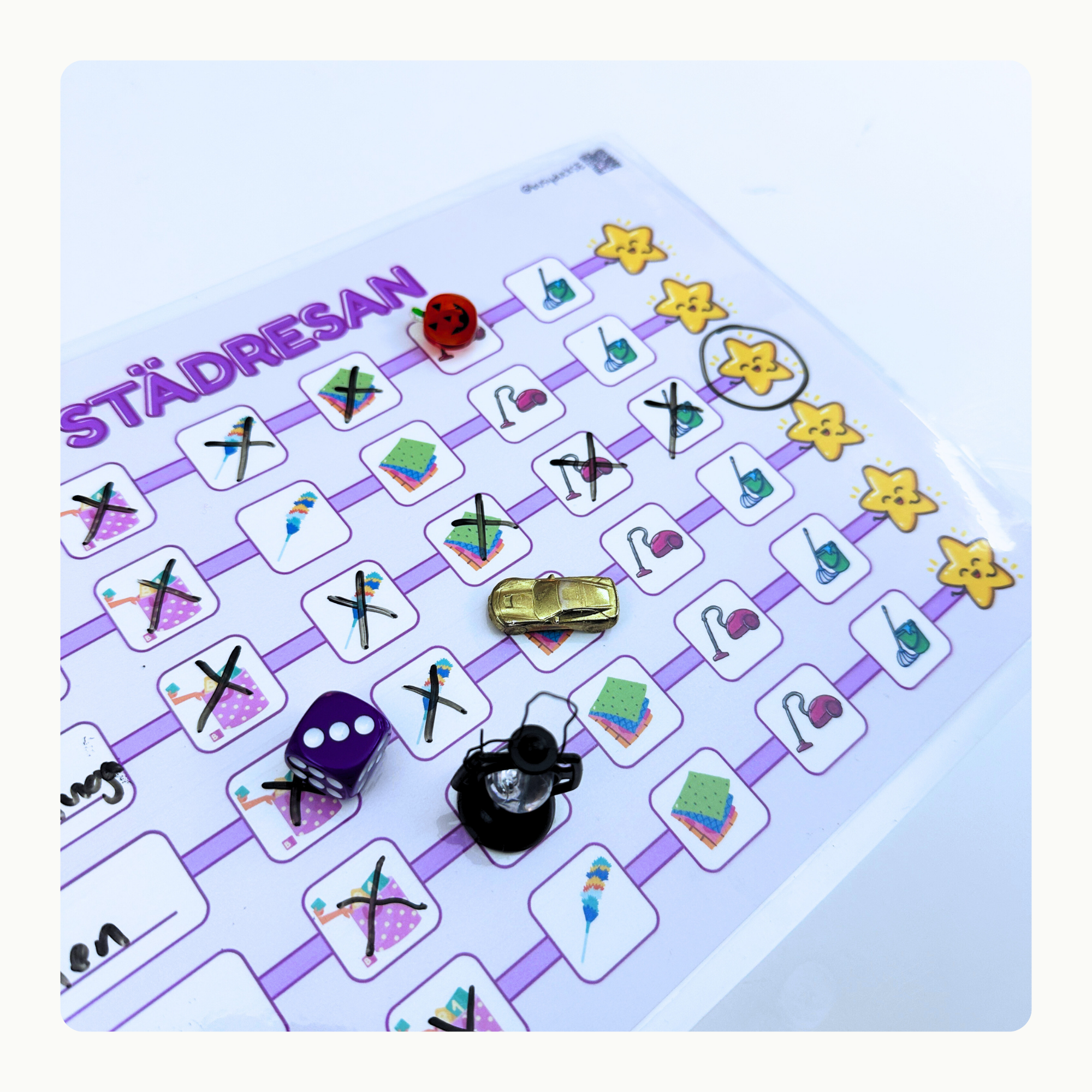 Städresan är ett utskrivbart städspel som hjälper barn att förstå, utföra och känna stolthet över hushållssysslor. Genom lekfulla spelplaner, tydliga uppdrag och strukturerade banor blir städning plötsligt konkret, begriplig och faktiskt rolig.