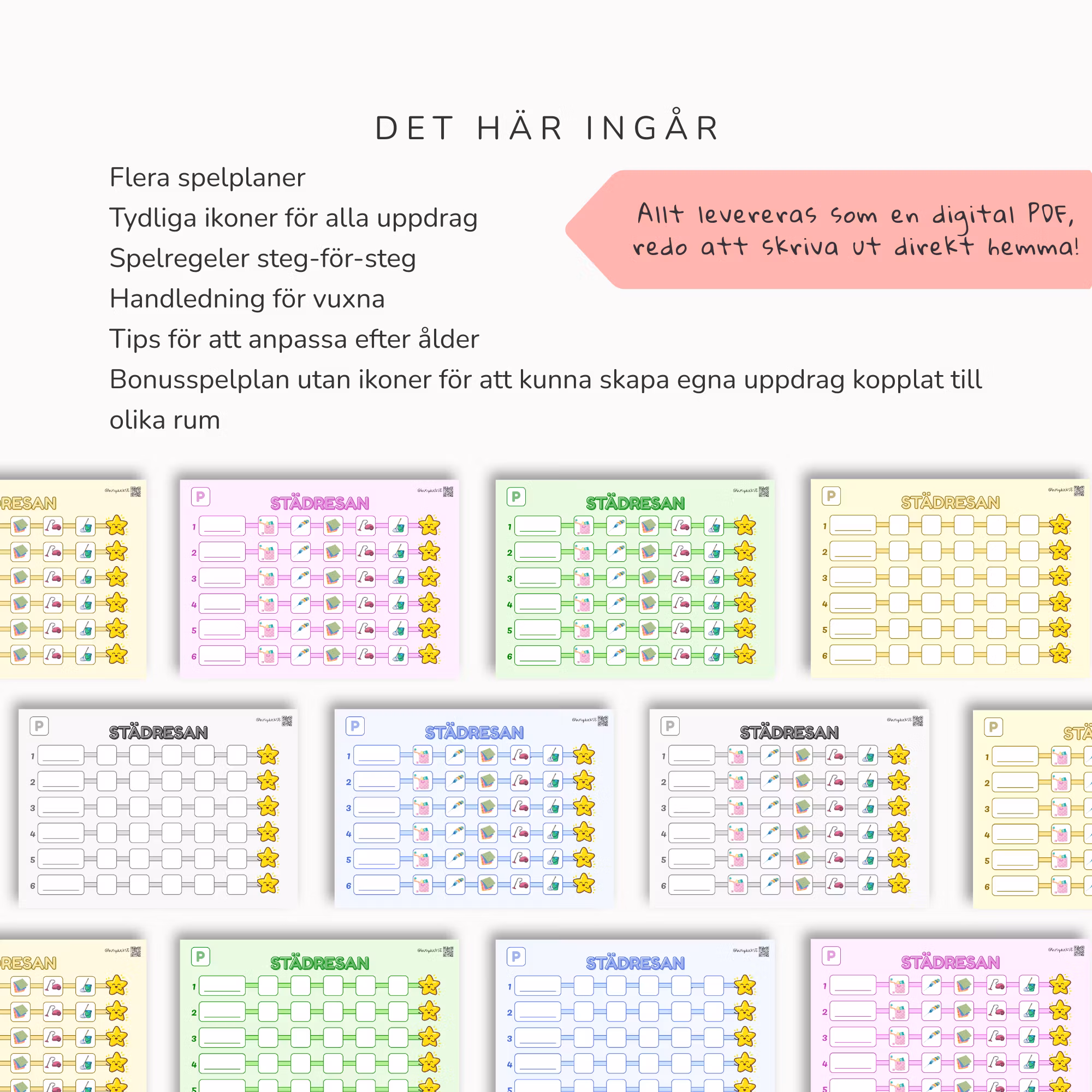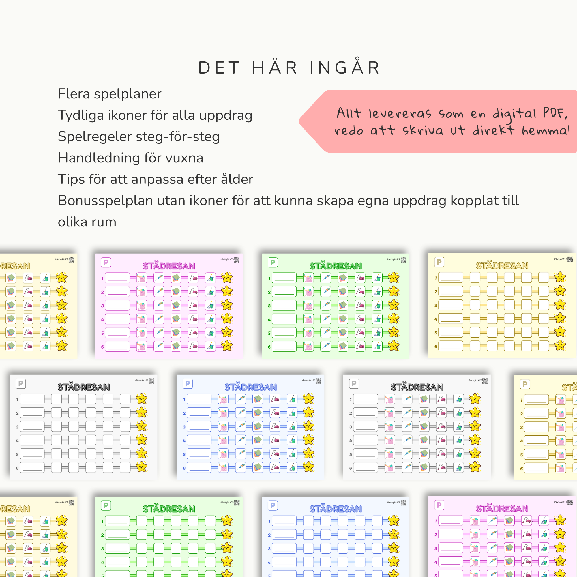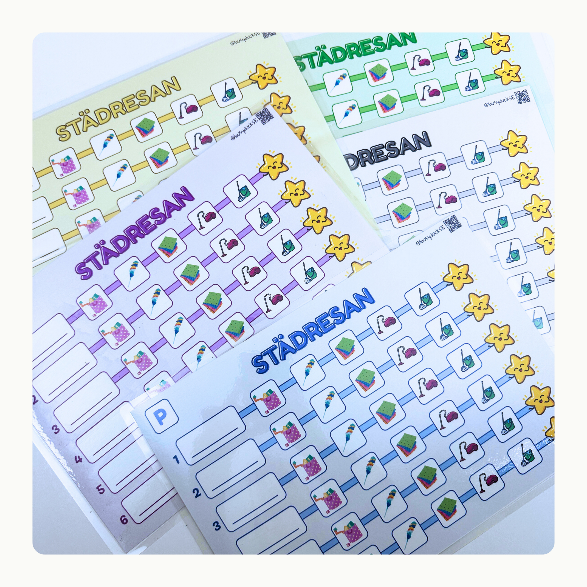 Städresan är ett utskrivbart städspel som hjälper barn att förstå, utföra och känna stolthet över hushållssysslor. Genom lekfulla spelplaner, tydliga uppdrag och strukturerade banor blir städning plötsligt konkret, begriplig och faktiskt rolig.