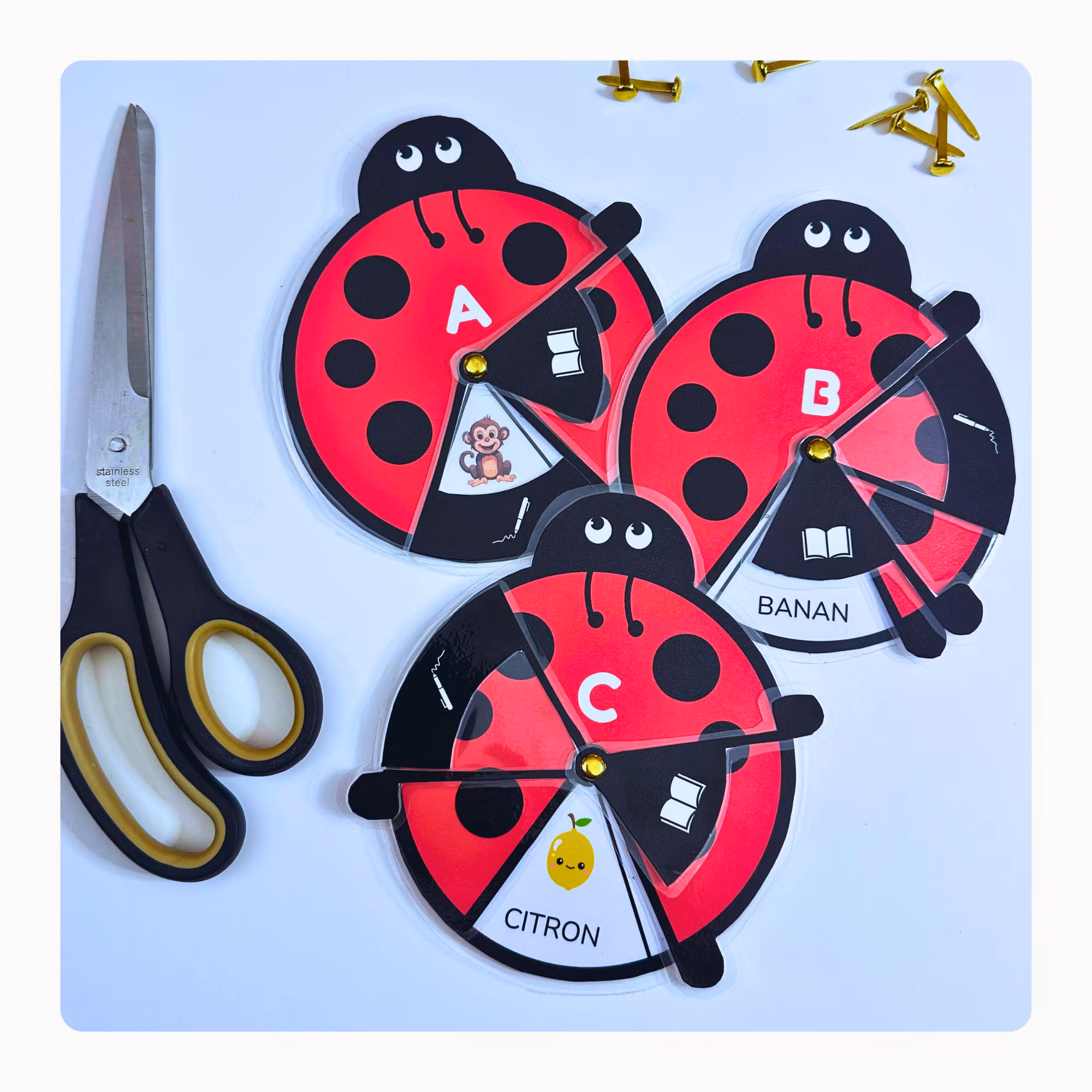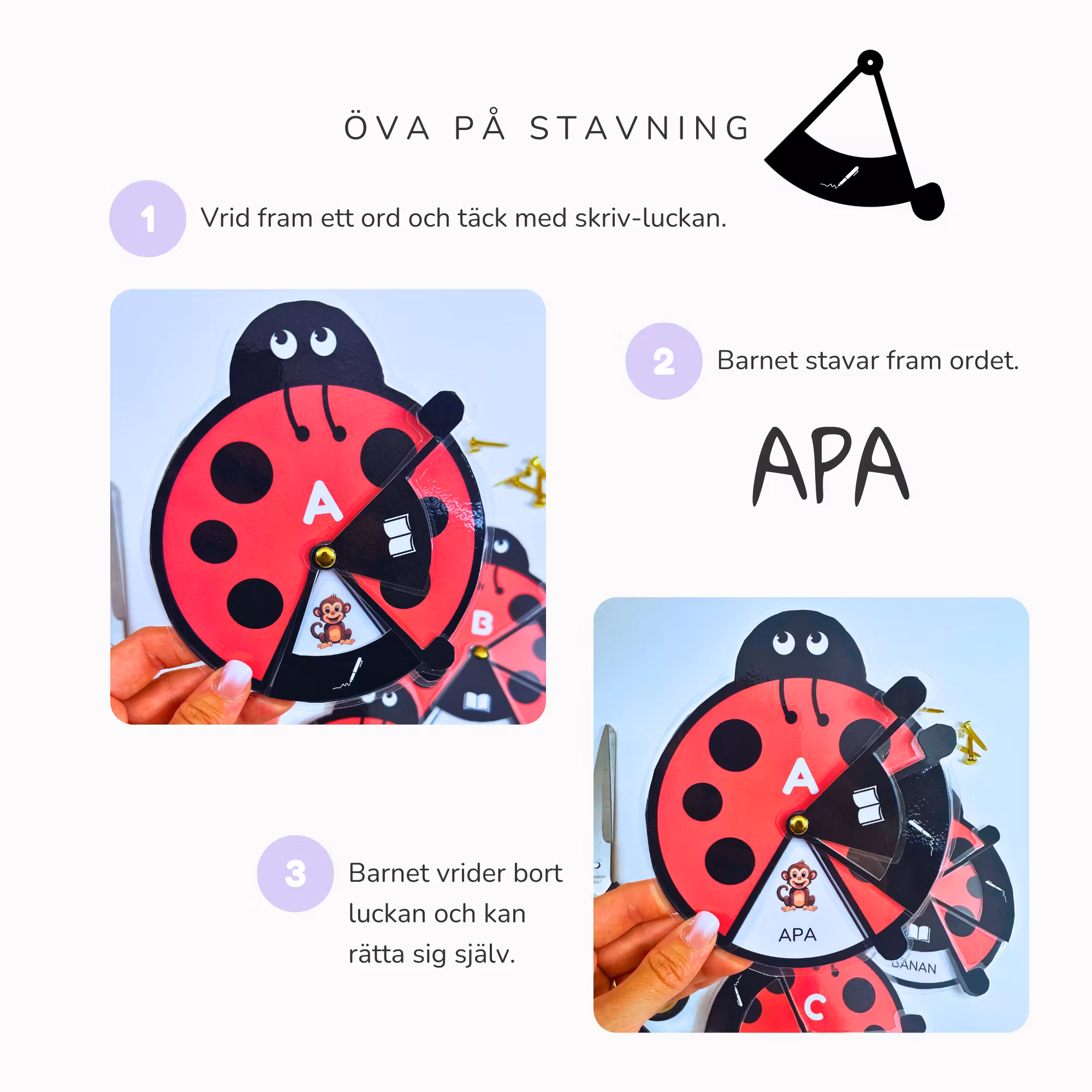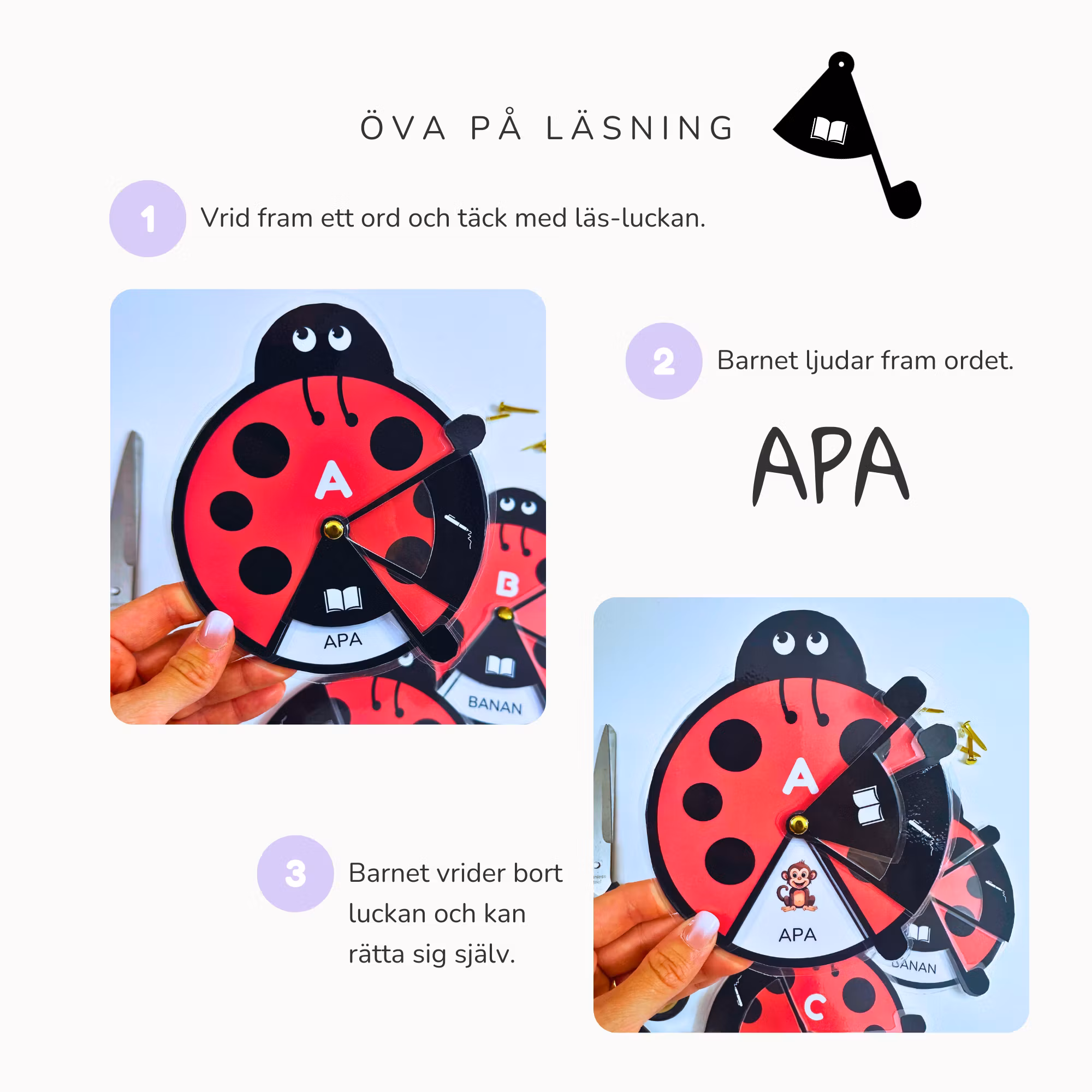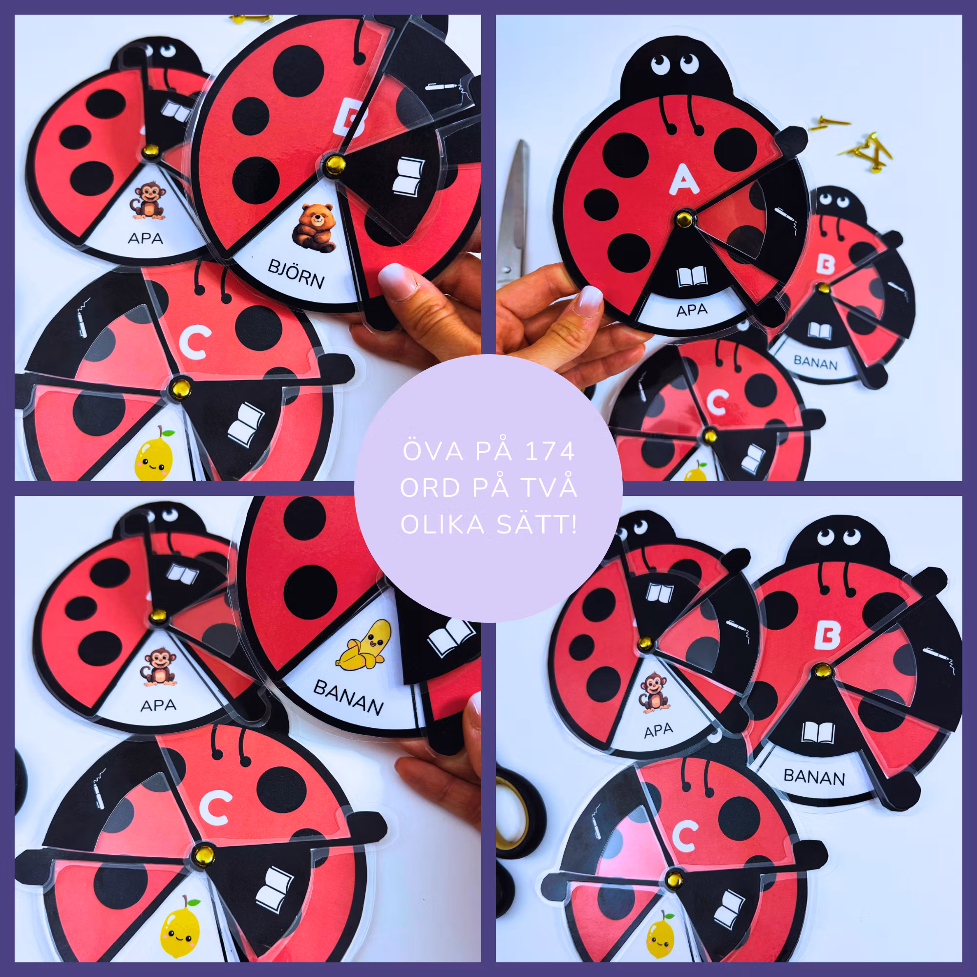 29 nyckelpigor med bokstäver och ord. Perfekt för läs- och stavträning. Lekfull övning som stärker fonologisk medvetenhet och läsutveckling.