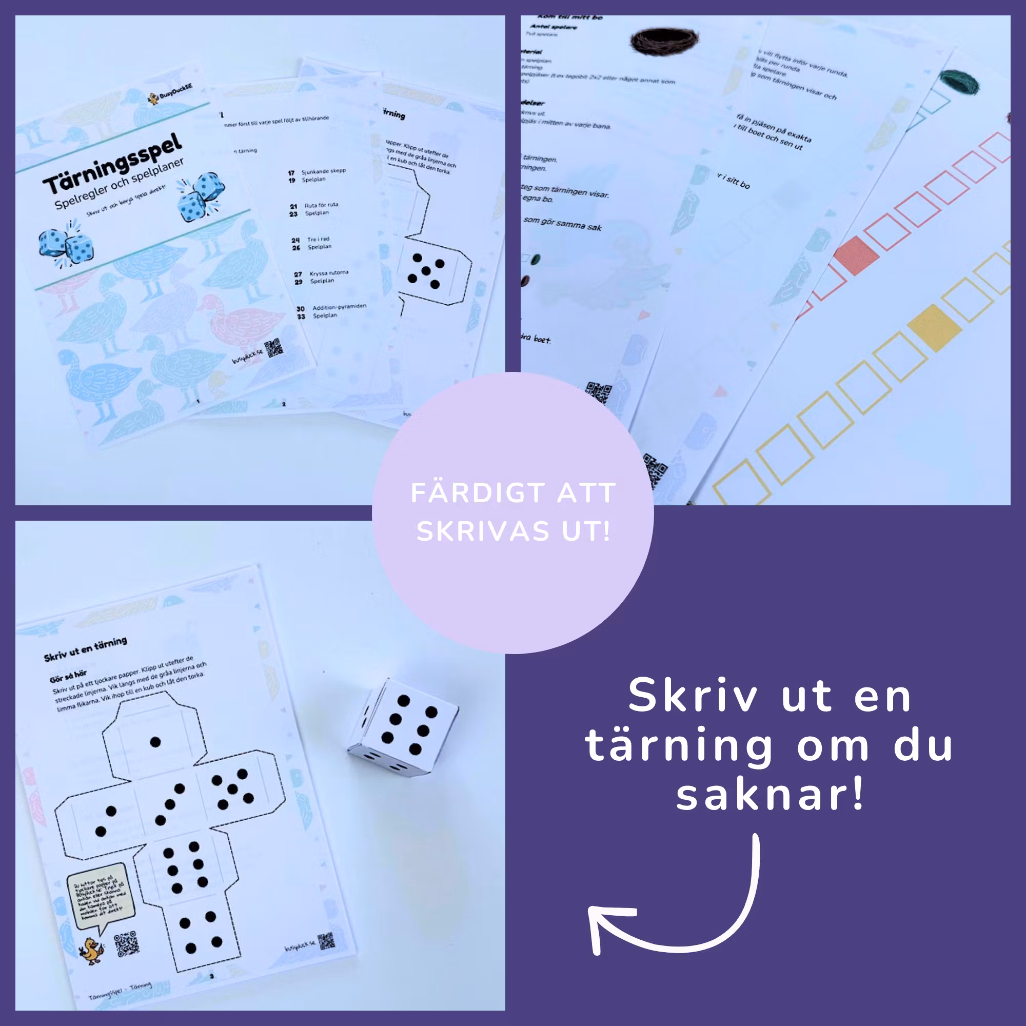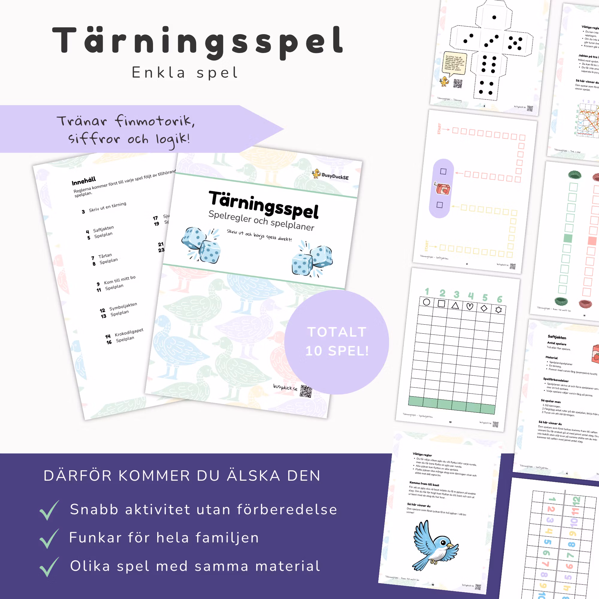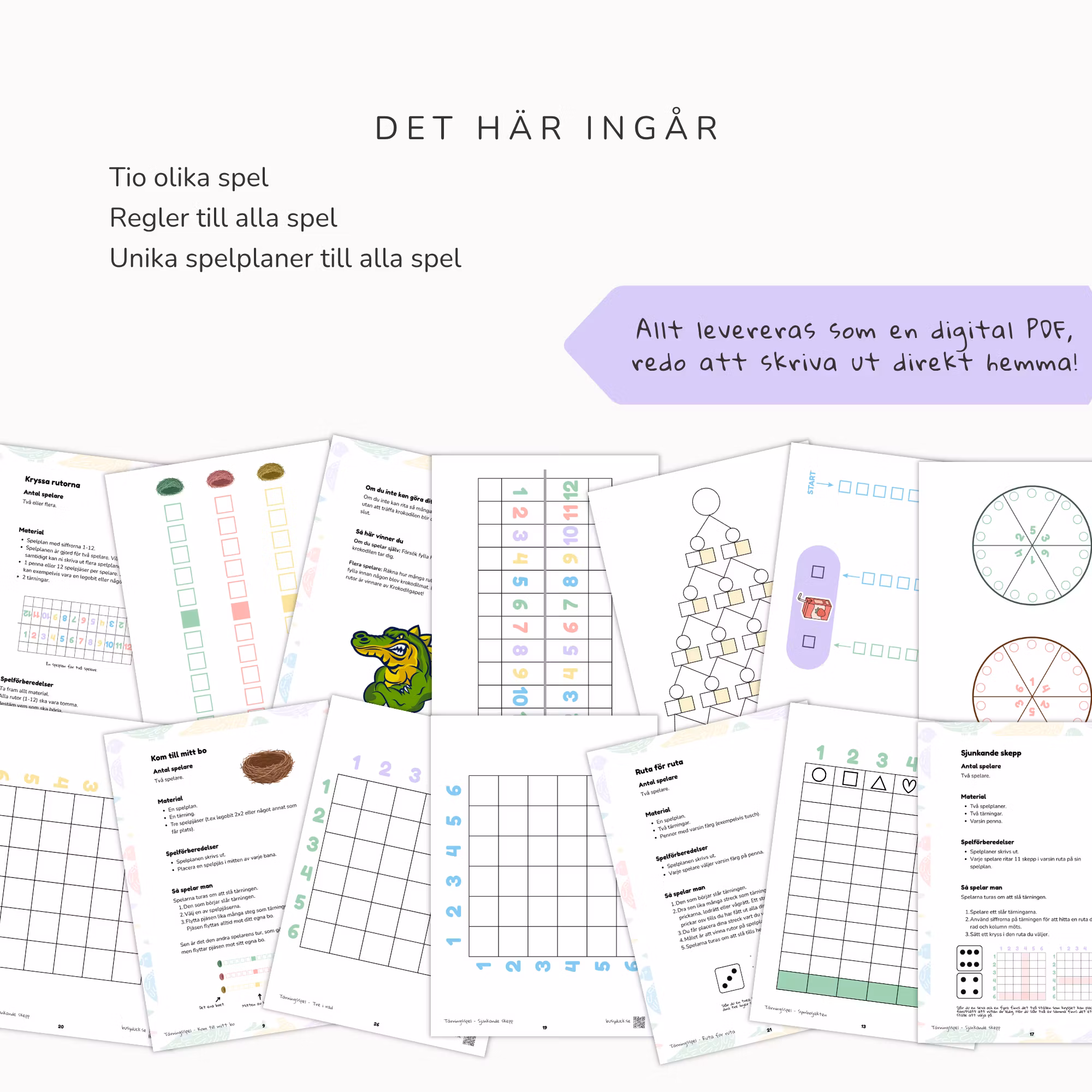 Det är tio olika tärningsspel som är redo att skrivas ut och börja användas direkt! Regler och spelplaner finns till alla spel.